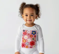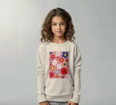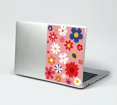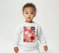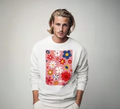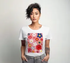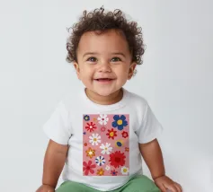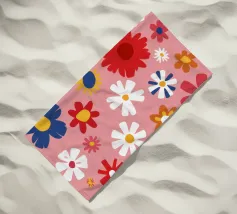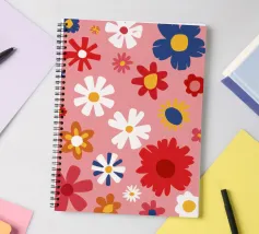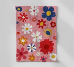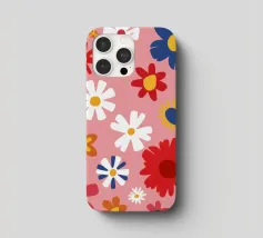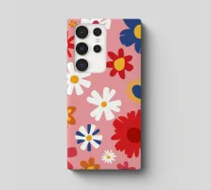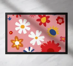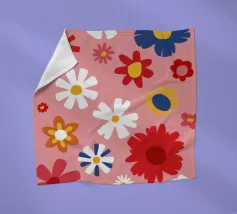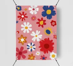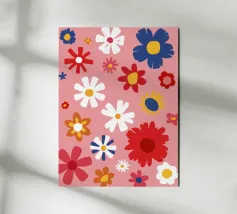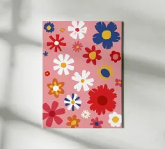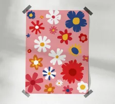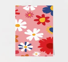 Un motivo allegro e d'ispirazione rétro di fiori e margherite stilizzati nei toni del rosa, del blu e del bianco, che creano una gioiosa esplosione floreale.