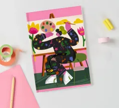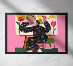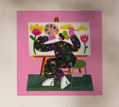 Artista al lavoro per dipingere una tela vivace con un fiore e forme astratte, circondato da pennelli, colori e ispirazione.