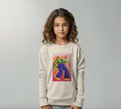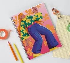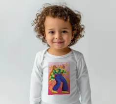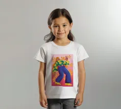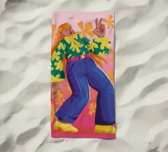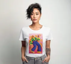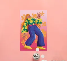 Questa opera d'arte raffigura una persona con un vivace top giallo a fiori e pantaloni blu, che assume una posa dinamica su uno sfondo rosa con motivi floreali arancioni.