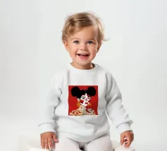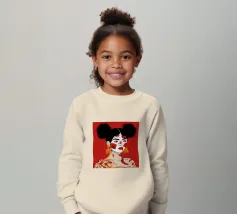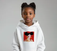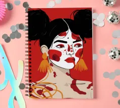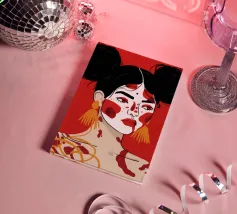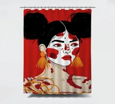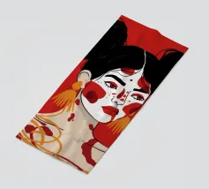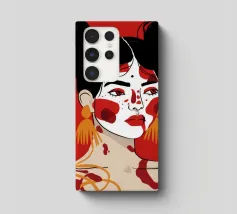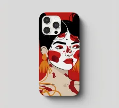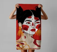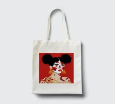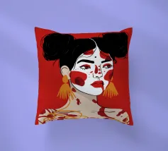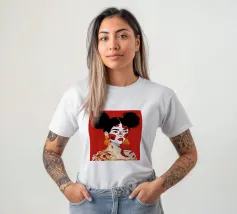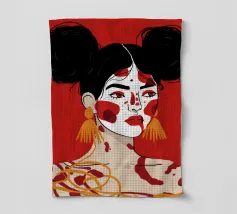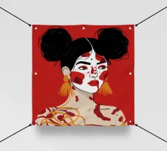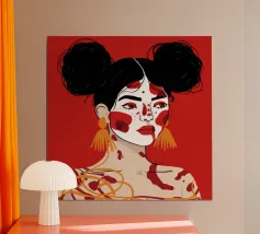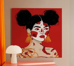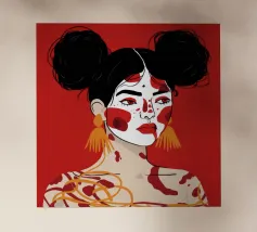 Questo dipinto raffigura una persona con i capelli scuri acconciati in due chignon, che indossa grandi orecchini arancioni. Il volto della persona è dipinto con audaci motivi rossi e bianchi, mentre lo sfondo è di colore rosso pieno.