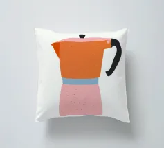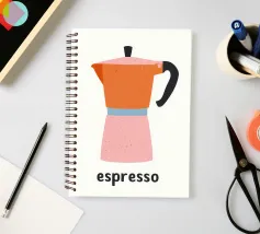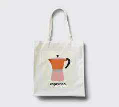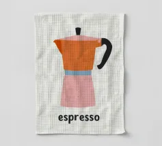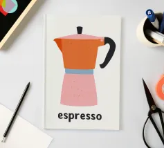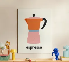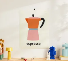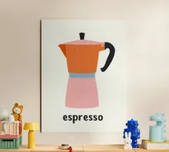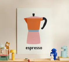 Un'affascinante illustrazione della cultura italiana del caffè: questa giocosa rappresentazione di una classica caffettiera per espresso affascina con la sua allegra combinazione di colori in arancione, rosa e azzurro. Lo stile pittorico naif con texture e macchioline visibili ricorda l'illustrazione scandinava e la grafica vintage di metà secolo. La forma ridotta e i contorni netti conferiscono all'oggetto quotidiano uno status iconico. La parola "espresso" sotto di essa funziona come una firma tipografica. Quest'opera allegra celebra la semplice bellezza del rito del caffè mattutino, perfetta per cucine e bar.