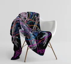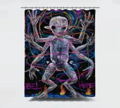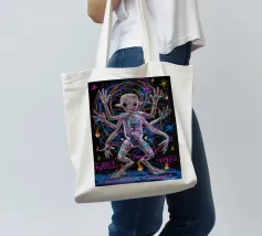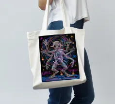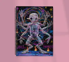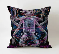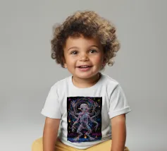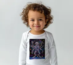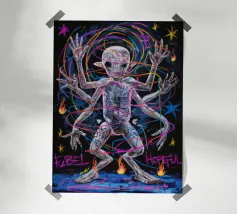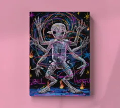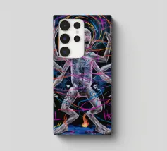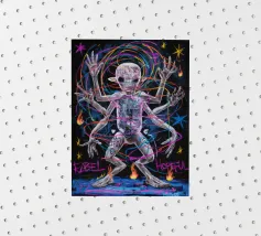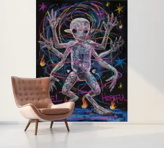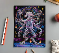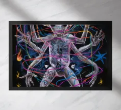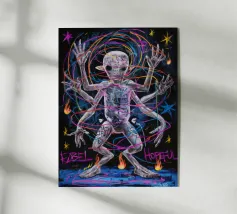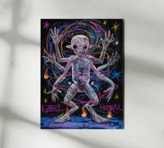 Una figura scheletrica con arti allungati irradia energia cosmica mentre forme vorticose la circondano. Luminosi motivi al neon arricchiscono la composizione surreale e fluida.