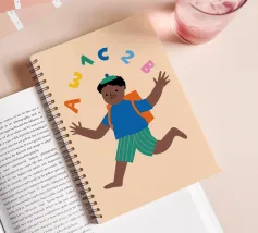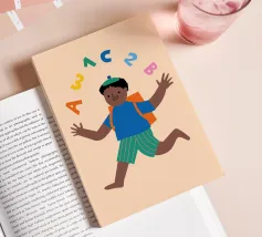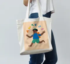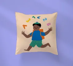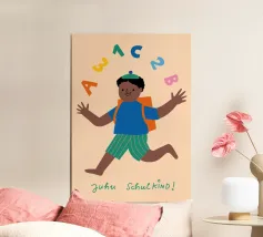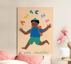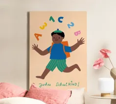 Evviva lo scolaro! Un bambino vivace con uno zaino blu, alle prese con le lettere. Pronto per iniziare la scuola.