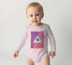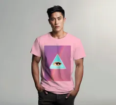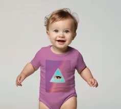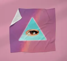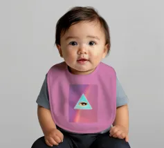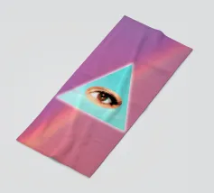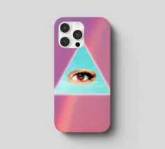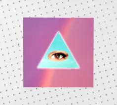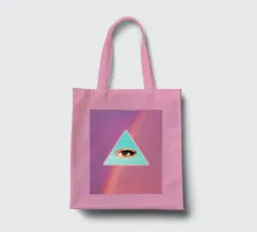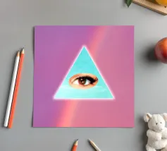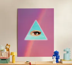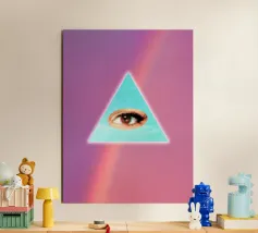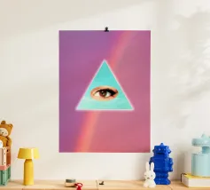 Arte concettuale astratta di un occhio retrò con ciglia folte all'interno di un triangolo blu, con uno sfondo sfumato rosa e viola e un arcobaleno. Spiritual hippie original art aura vibes by MsGonzalez