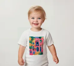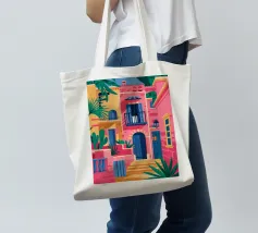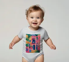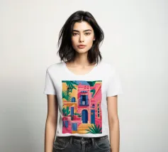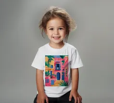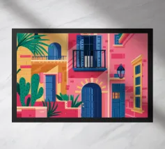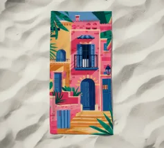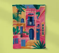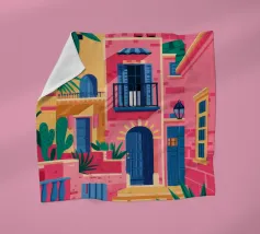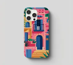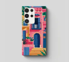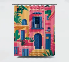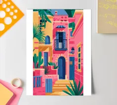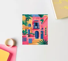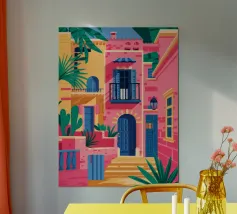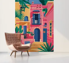 La vibrante facciata di un edificio, dipinta nei toni del rosa e dell'indaco, è ornata da piante e fiori verdi che si arrampicano sulle pareti, mettendo in mostra un dettaglio architettonico ricco e colorato.