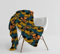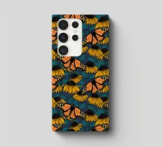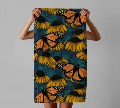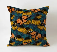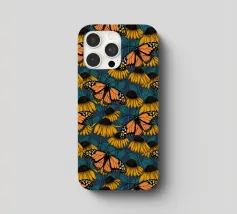 Modello senza cuciture disegnato a mano con fiori di conifera e farfalle monarca.