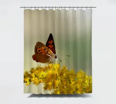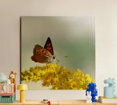 Farfalla Piccola farfalla di fuoco su un fiore giallo, ripresa macro