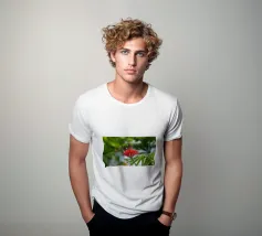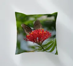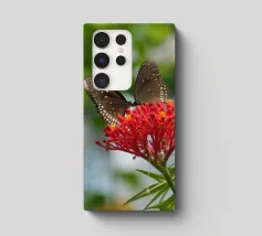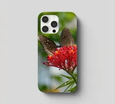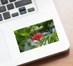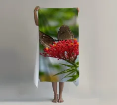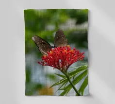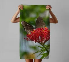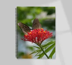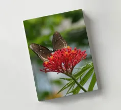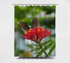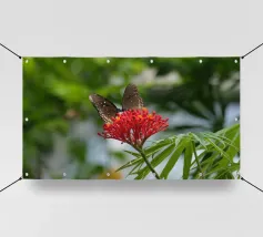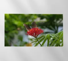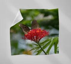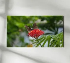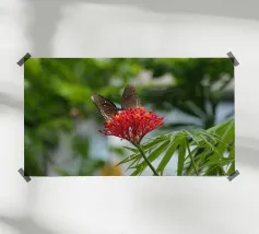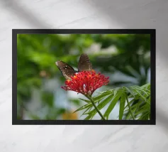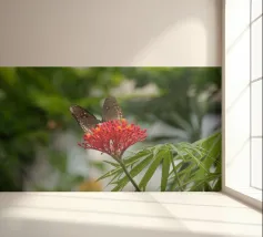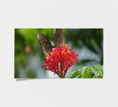 Due farfalle dalle ali delicate e maculate sono appollaiate su vivaci fiori rossi, circondati da un fogliame verde e rigoglioso. La scena cattura un momento di bellezza naturale e di tranquillità.
