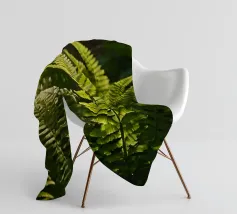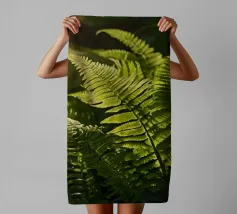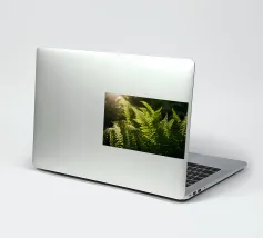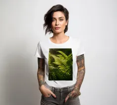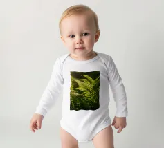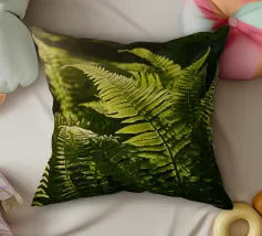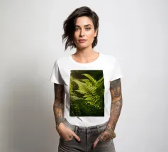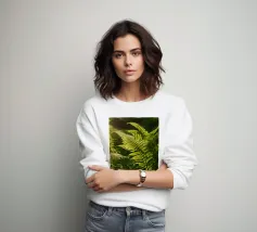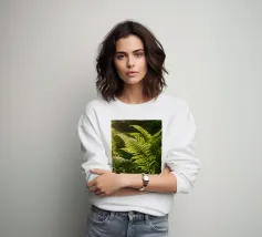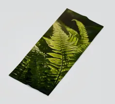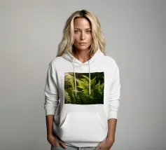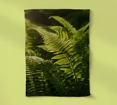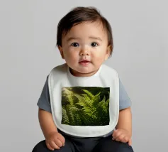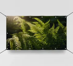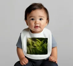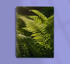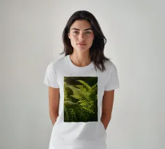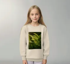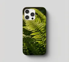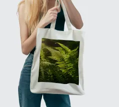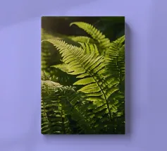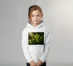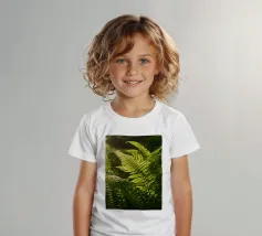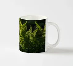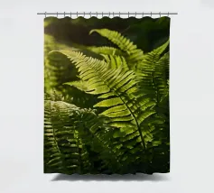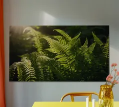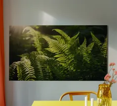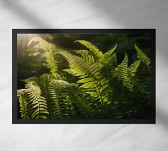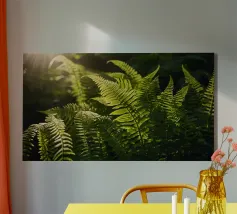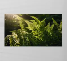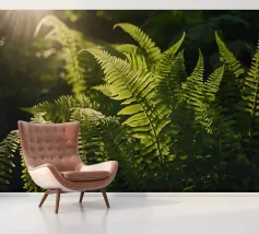 Vibranti felci si protendono verso l'alto, crogiolandosi nella calda luce del sole che filtra attraverso gli alberi in un sereno ambiente forestale durante le ore del tardo pomeriggio.
