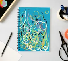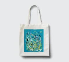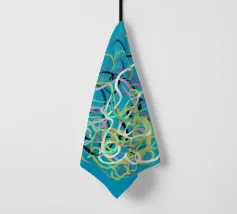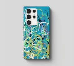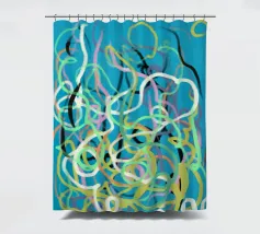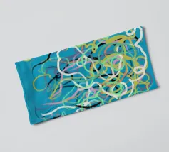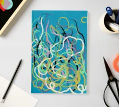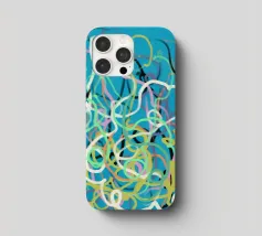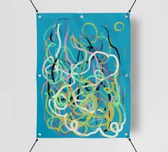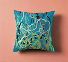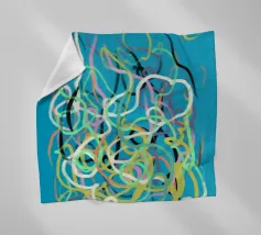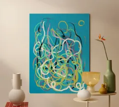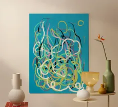 Una varietà di linee colorate e aggrovigliate crea una composizione astratta su uno sfondo turchese. I tratti intricati e sovrapposti nei toni del giallo, del rosa, del bianco e del nero evocano un senso di caos stravagante.