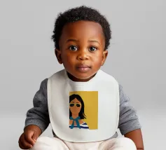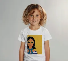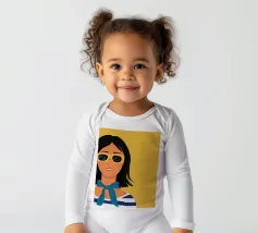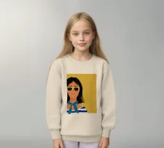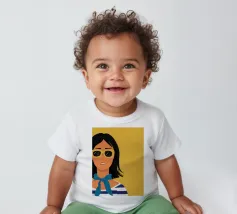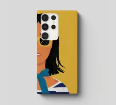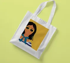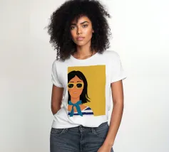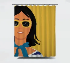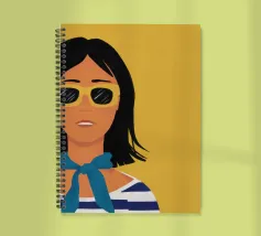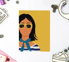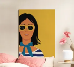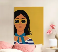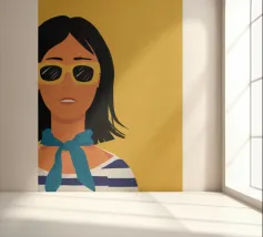 Un ritratto audace di una donna sicura di sé con capelli corti e scuri, che indossa occhiali da sole e un foulard blu, su uno sfondo giallo oro di grande effetto.