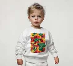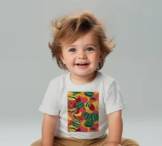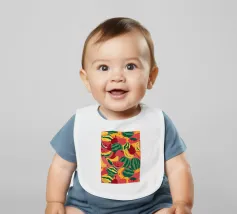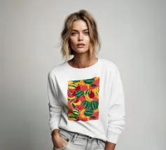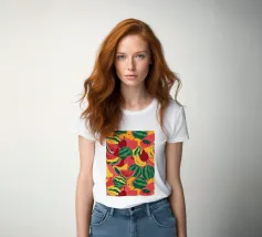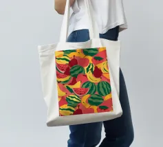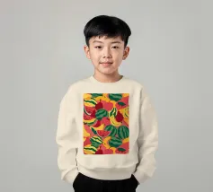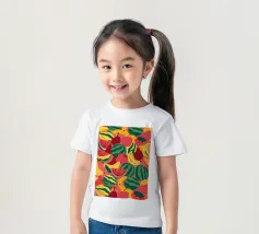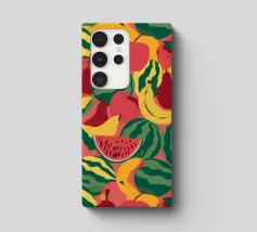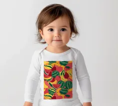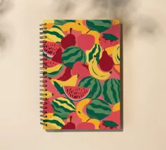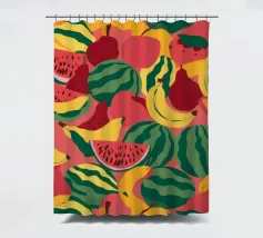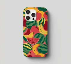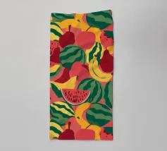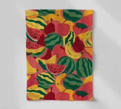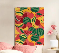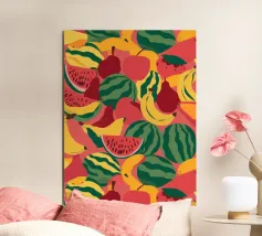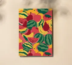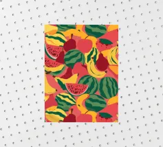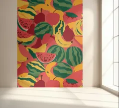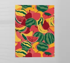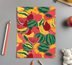 Un vivace disegno di frutta con angurie, pere e bacche stilizzate in una disposizione densa e colorata. I colori sono rosso, verde, rosa e giallo.