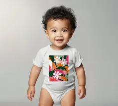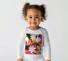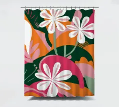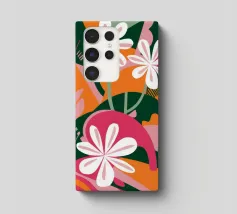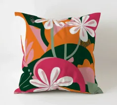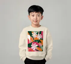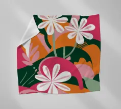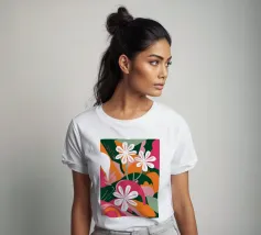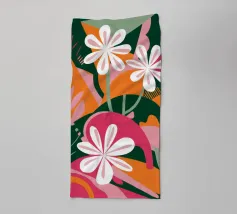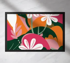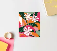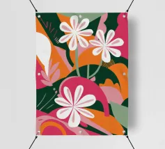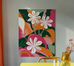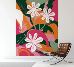 Una splendida composizione astratta di fiori primaverili stilizzati, con morbidi petali bianchi e rosa, crea un pezzo floreale fresco, moderno ed elegante che celebra la bellezza delle nuove fioriture.