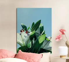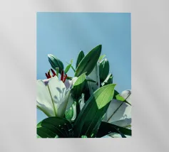Ogni fiore si erge su un esile stelo verde, irradiando purezza e tranquillità. Il profumo morbido riempie l'aria, sottile ma rilassante, mentre il colore bianco puro simboleggia pace, innocenza e rinnovamento. Circondati da foglie verdi e rigogliose, i gigli ondeggiano dolcemente nella brezza, senza tempo e sereni".