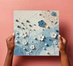 Il colore applicato crea una texture vivace, quasi tangibile, che infonde vita ai fiori. Nonostante le pennellate decise, il dipinto irradia una struttura calma che pone lo spettatore in un dialogo tranquillo con la natura. I colori blu e bianco si armonizzano perfettamente e trasmettono una sensazione di pace e innocenza. Quest'opera d'arte è un'ode alla bellezza tranquilla e travolgente della natura, toccante nella sua semplicità e profondità.