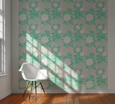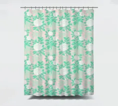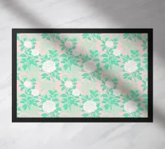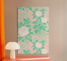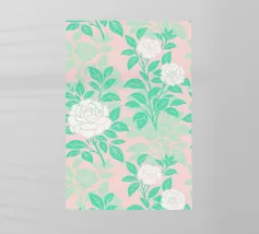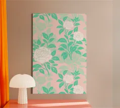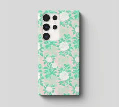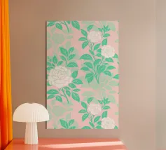 Bellissima stampa floreale con fiori di camelia bianchi e foglie verdi, su uno sfondo color pesca.