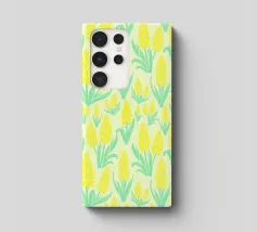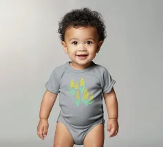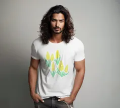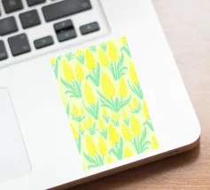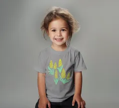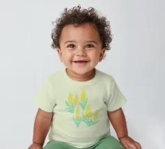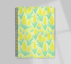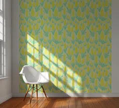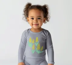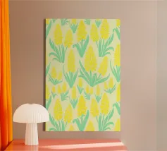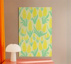 Simpatica stampa floreale con fiori di giacinto giallo sole e foglie verdi, su sfondo giallo burro.