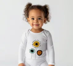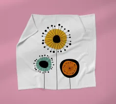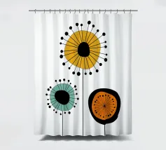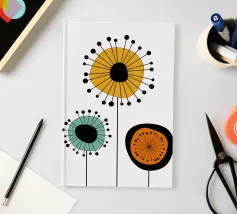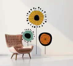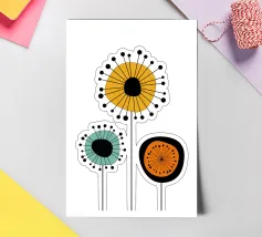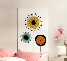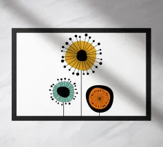 Un delizioso disegno con tre capricciose teste di fiori con petali punteggiati nei vivaci colori arancione, verde acqua e giallo. Ispirata alla gioia dell'infanzia e alla creatività innocente, questa opera d'arte cattura uno spirito giocoso con forme semplici e colorate. Perfetta come stampa a sé stante, come opera d'arte da parete o come decorazione per la casa, questa opera versatile aggiunge un tocco di allegria a qualsiasi ambiente.
