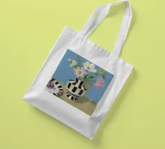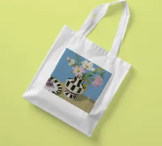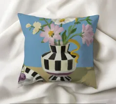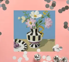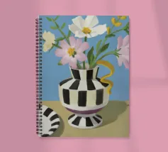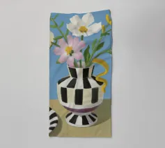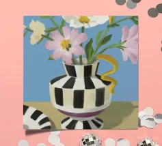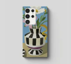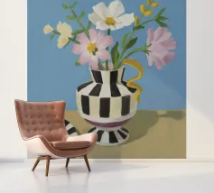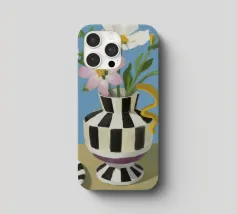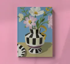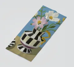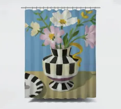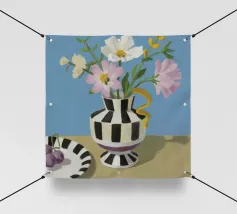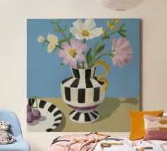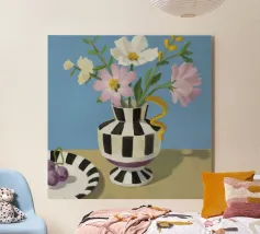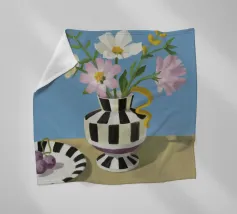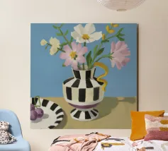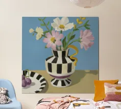 Un bouquet di fiori bianchi e chiari è elegantemente disposto in un vaso a righe bianche e nere. Un piatto con prugne o fichi è vicino, su uno sfondo blu tenue.