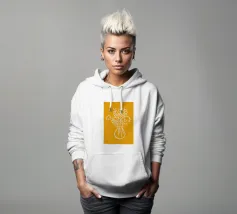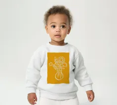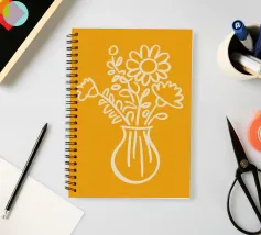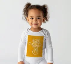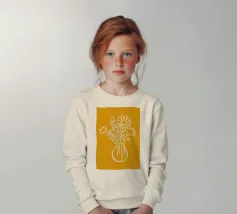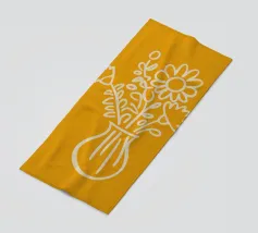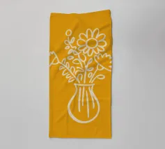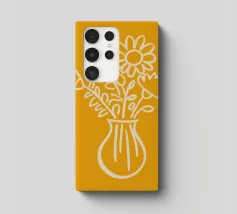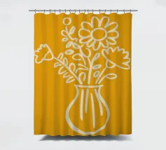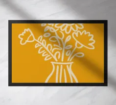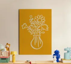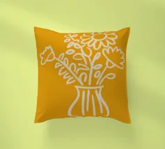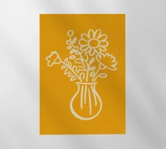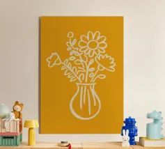 Disegno astratto di un vaso con fiori su sfondo giallo.