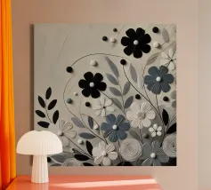 Il colore applicato crea una texture vivace, quasi tangibile, che infonde vita ai fiori. Nonostante le pennellate decise, il dipinto irradia una struttura calma che pone lo spettatore in un dialogo tranquillo con la natura. I colori bianco e nero si armonizzano perfettamente e trasmettono una sensazione di pace e innocenza. Quest'opera d'arte è un'ode alla bellezza tranquilla e travolgente della natura, toccante nella sua semplicità e profondità.