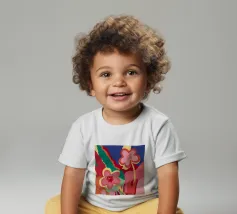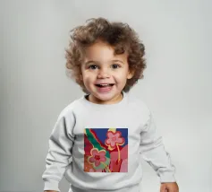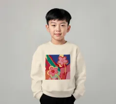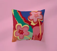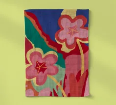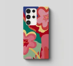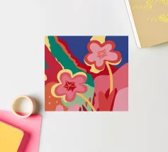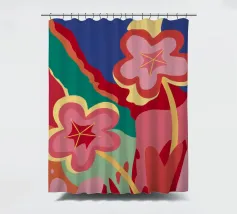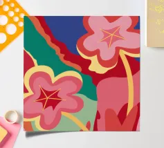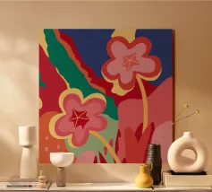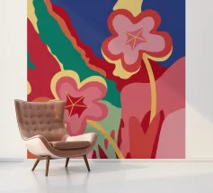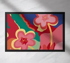 Fiori stilizzati rossi e rosa dalle forme semplici e decise si stagliano su uno sfondo ricco e scuro, creando un design floreale retrò e grafico con un tocco di nostalgia.