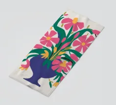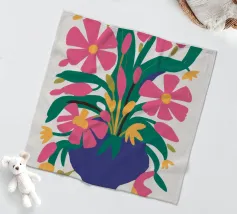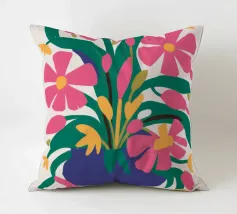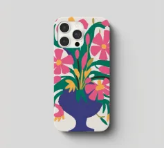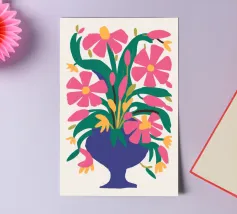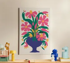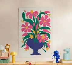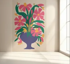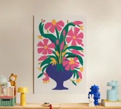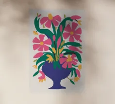 Un vibrante bouquet di fiori rosa e rossi stilizzati irrompe da un vaso blu scuro, circondato da foglie verdi, creando una classica natura morta con un tocco moderno e audace.