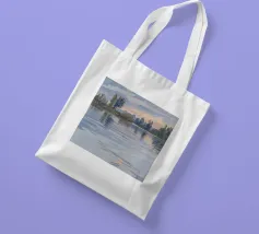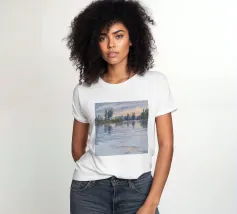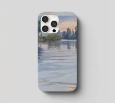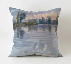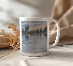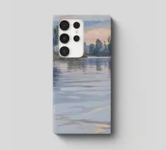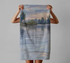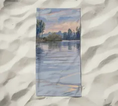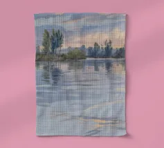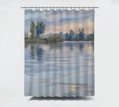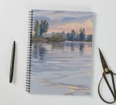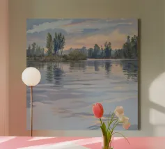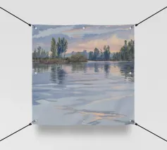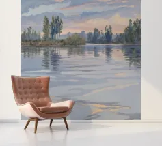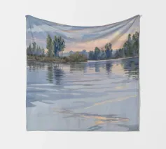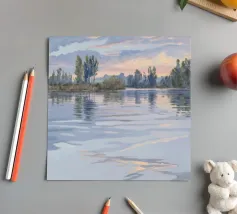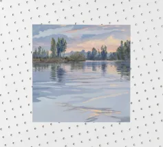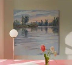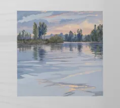 Un fiume al crepuscolo con colori tenui e un'atmosfera tranquilla.
