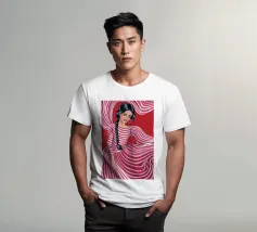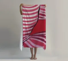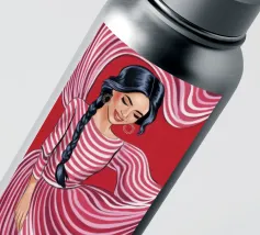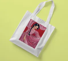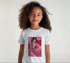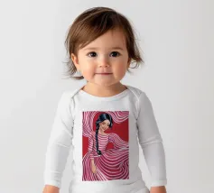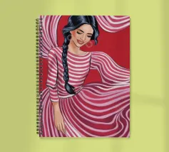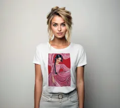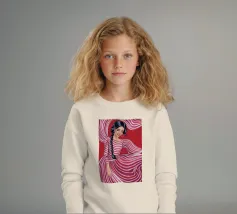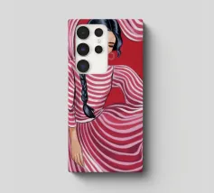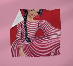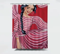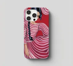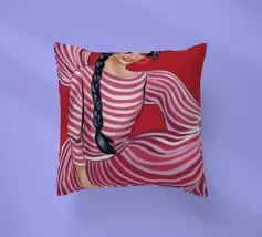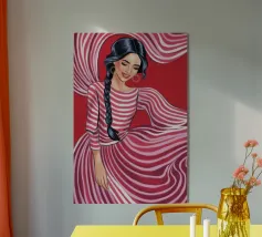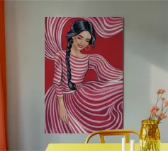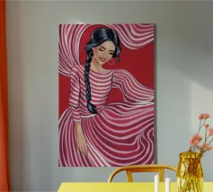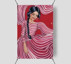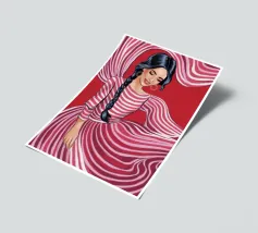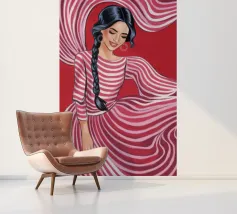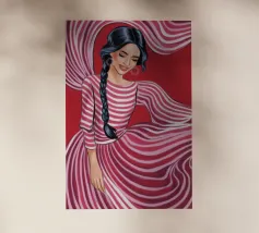 Questa opera d'arte mostra una persona con lunghi capelli intrecciati, vestita con un abito a righe, su uno sfondo rosso. La scena incarna l'estrosità e il movimento.
