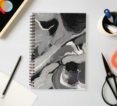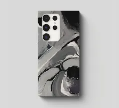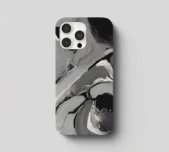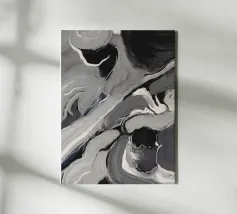 Sfumature vorticose di nero, grigio e bianco creano un motivo dinamico e astratto. Le forme organiche e le linee fluide evocano un senso di movimento e profondità.