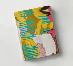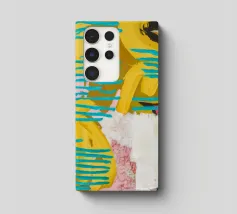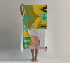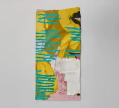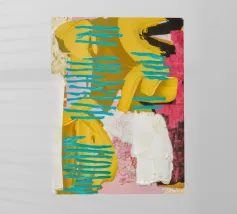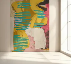Un'audace pittura astratta caratterizzata da ampie aree di turchese e giallo brillante, contrastate da forme e linee bianche e nere, che suggeriscono una collisione dinamica o un flusso di forze elementari.