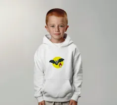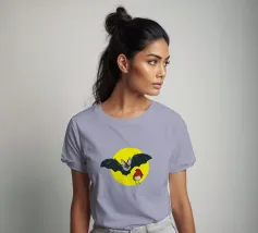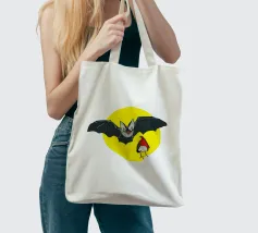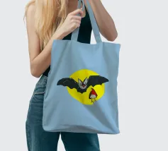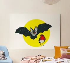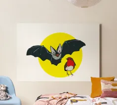 Un pipistrello che vola verso un piccolo pettirosso con sfondo giallo. Amicizia. Amanti degli animali. Amanti degli uccelli.