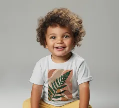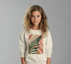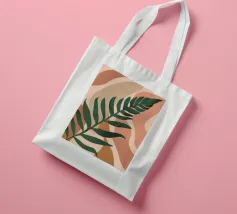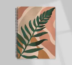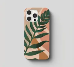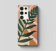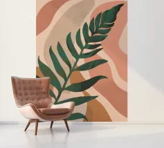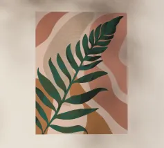 Un'illustrazione semplice ed elegante di una singola grande foglia di palma su uno sfondo morbido e strutturato a due tonalità. Lo stile è minimalista e rilassante.
