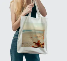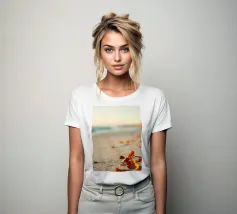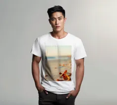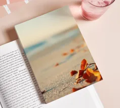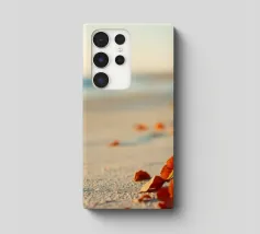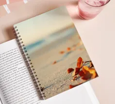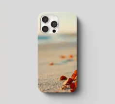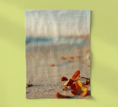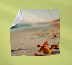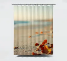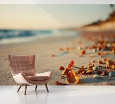 Colorate foglie autunnali si posano sulla riva sabbiosa mentre le dolci onde dell'oceano lambiscono la spiaggia durante un sereno tramonto. L'atmosfera tranquilla esalta la bellezza della natura.