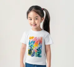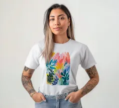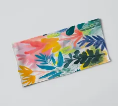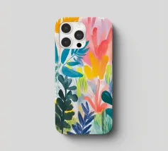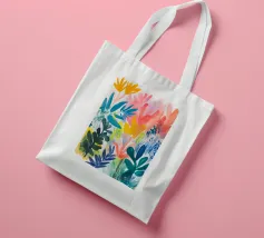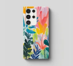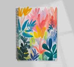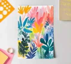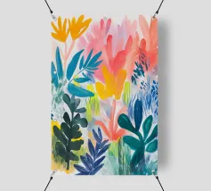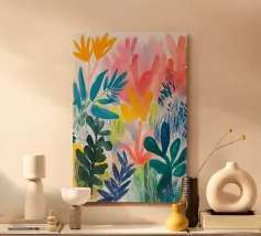Il fogliame vibrante in varie tonalità di blu, rosa e giallo crea una rappresentazione vivace e colorata della natura. Le forme astratte si sovrappongono e si fondono, suggerendo una scena di giardino lussureggiante e variegata.