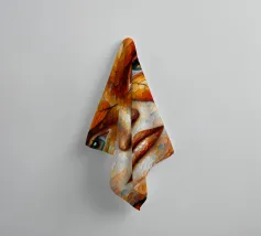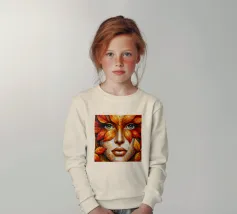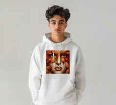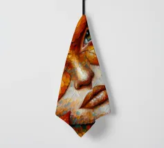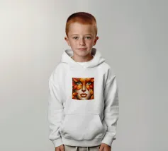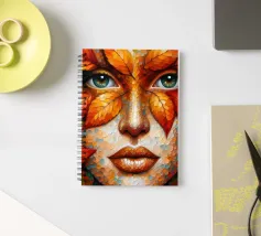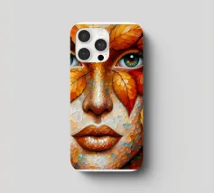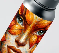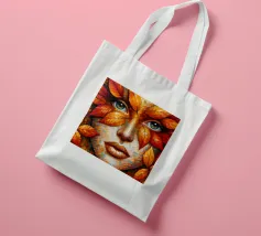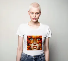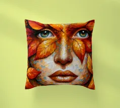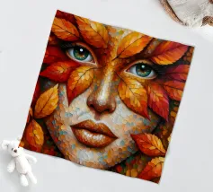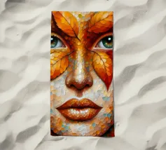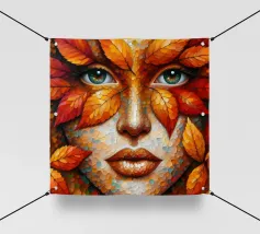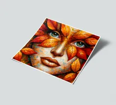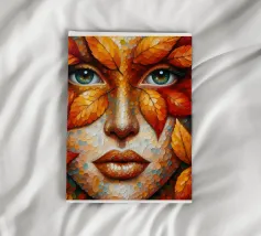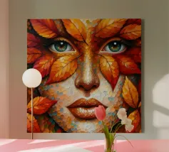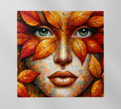 Dipinto ad acrilico di un volto che si fonde senza soluzione di continuità con una cascata di foglie autunnali. Gli occhi del soggetto sono affascinanti, resi con dettagli realistici e un accenno di luce riflettente che attira lo spettatore, esprimendo un senso di calma e mistero. A circondare gli occhi e a incorniciare il volto sono le ricche e calde tonalità delle foglie arancioni, rosse e dorate, le cui trame e forme creano un effetto dinamico, quasi un mosaico.