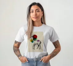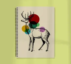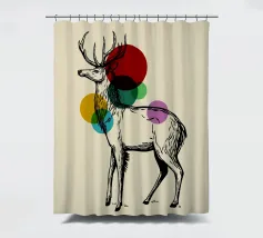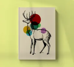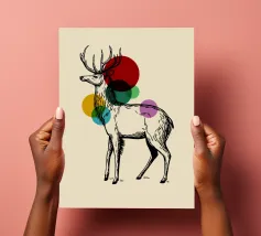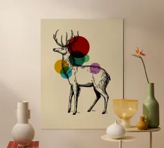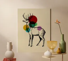 Una graziosa illustrazione a inchiostro nero di un maestoso cervo, ornata da audaci cerchi colorati sovrapposti che aggiungono un tocco moderno alla classica figura del bosco. Questo pezzo simboleggia l'equilibrio tra natura e arte astratta, rendendolo ideale per interni rustico-moderni o eclettici.