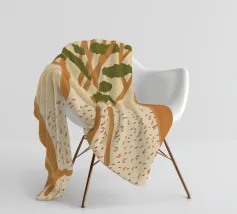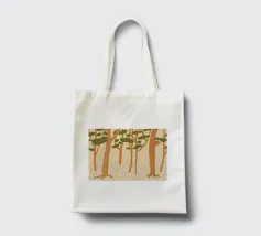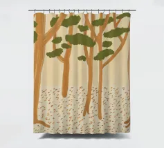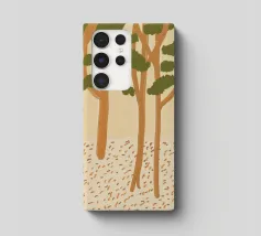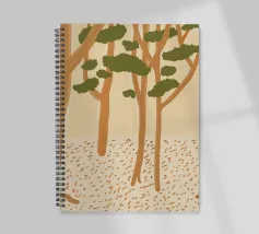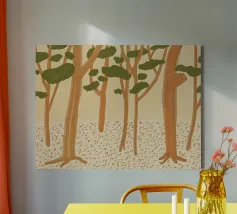 Un gruppo di alberi slanciati con tronchi marrone chiaro e chioma verde è raffigurato in una scena di foresta stilizzata. Il terreno è ricoperto da piccole macchioline bruno-rossastre, che fanno pensare a foglie o fiori caduti.