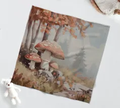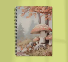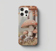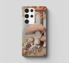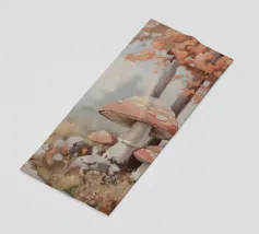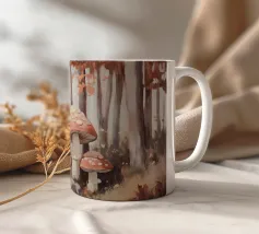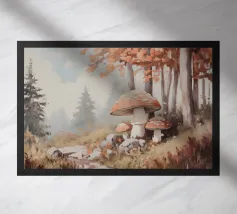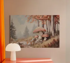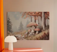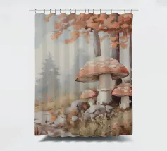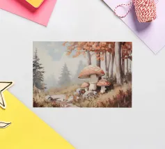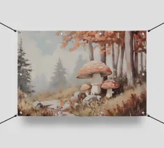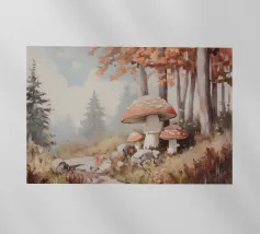 Tranquilla scena di foresta con alberi alti con foglie autunnali vivaci, grandi funghi rossi con macchie bianche circondati da erba e rocce e un'atmosfera nebbiosa con alberi di conifere lontani.
