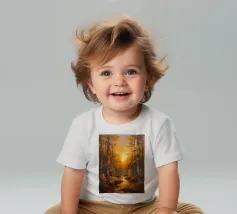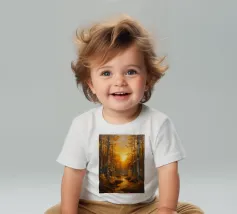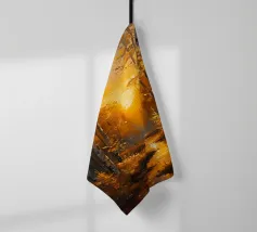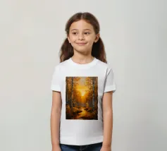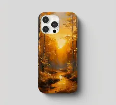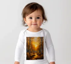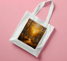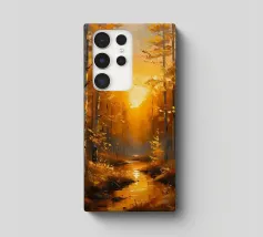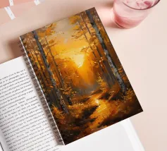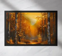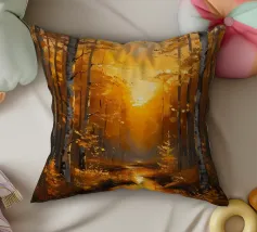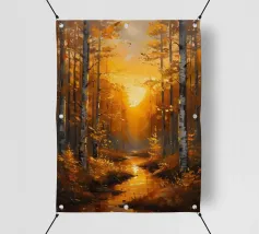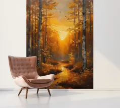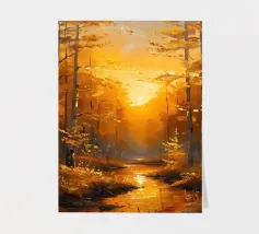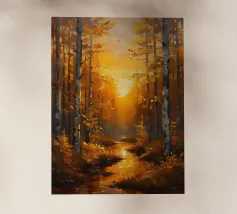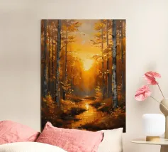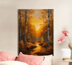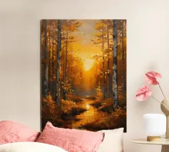Un dipinto a olio mozzafiato di una foresta autunnale, immersa nel caldo bagliore del sole al tramonto. I colori vibranti e i dettagli intricati catturano l'essenza della bellezza della natura.