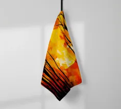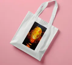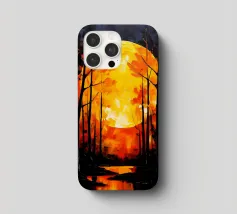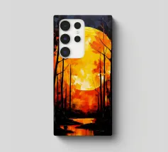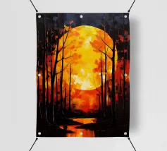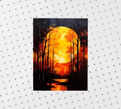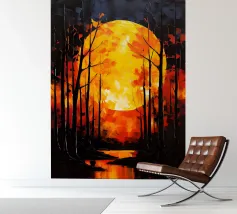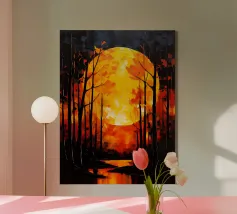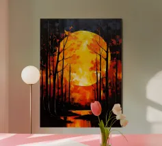 Un dipinto a olio vibrante e accattivante che raffigura una silhouette di alberi contro un tramonto infuocato. La grande luna arancione domina il cielo, proiettando tonalità calde sul paesaggio. Le sagome scure degli alberi creano un contrasto sorprendente, aggiungendo profondità e mistero alla scena.