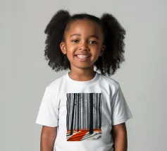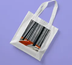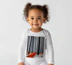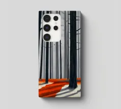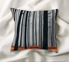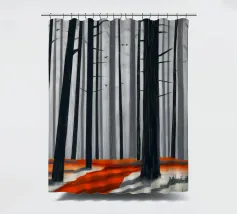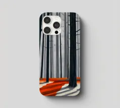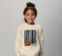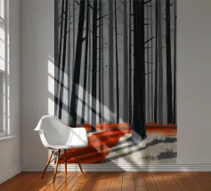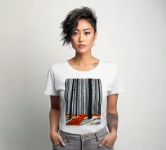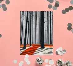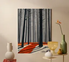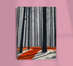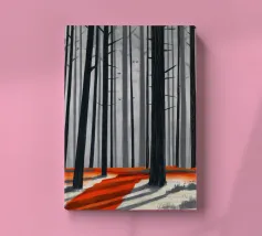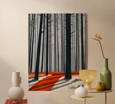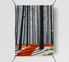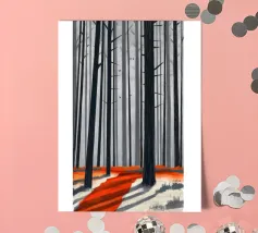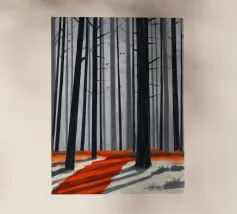 Una rappresentazione grafica di una fitta foresta di betulle o pioppi in inverno, utilizzando una tavolozza monocromatica con un tocco di arancione sul terreno innevato.