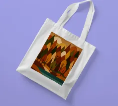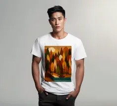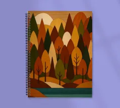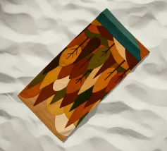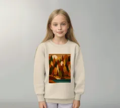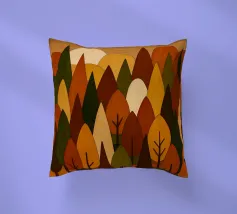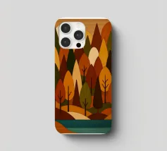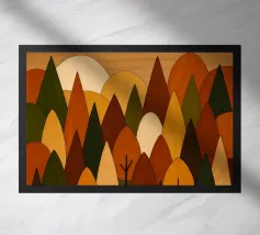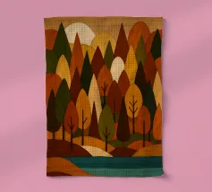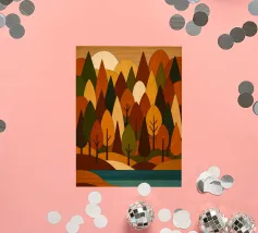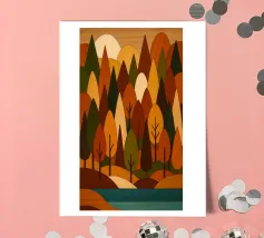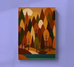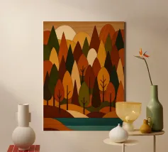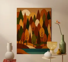 Una scena di foresta stilizzata e armoniosa con fiume, ricca di calde tonalità autunnali in un effetto legno con legni colorati. (Una miscela di forme geometriche e curve morbide per formare gli alberi, ciascuno con una combinazione unica di colori come l'arancione bruciato, il verde intenso, il giallo oro e il marrone terroso. Questi colori si fondono magnificamente, evocando la sensazione dell'autunno, quando la tavolozza della natura è al suo massimo splendore.