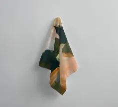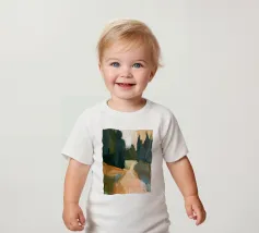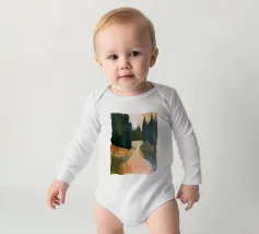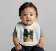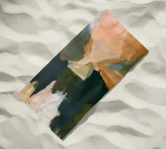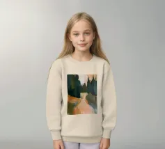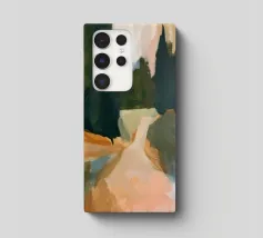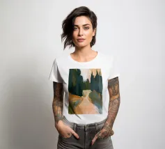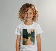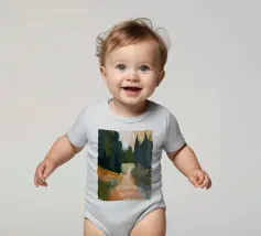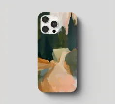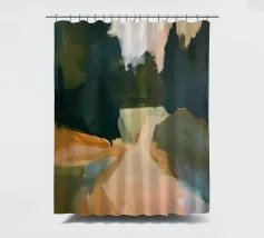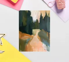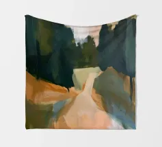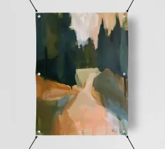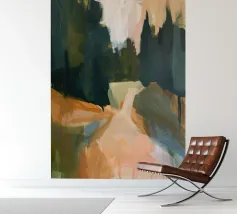 Paesaggio astratto dipinto con verdi profondi e calde tonalità della terra, che suggerisce un tranquillo sentiero nella foresta immerso in una luce soffusa.