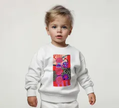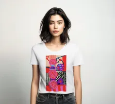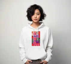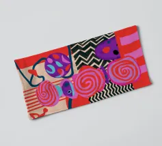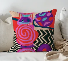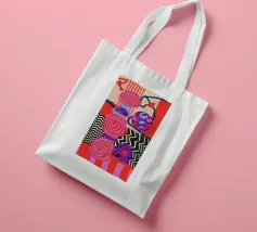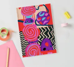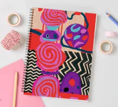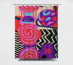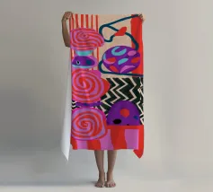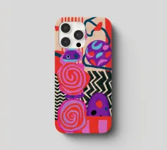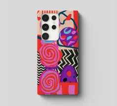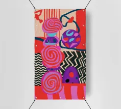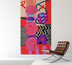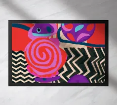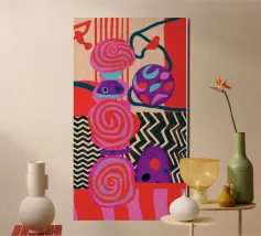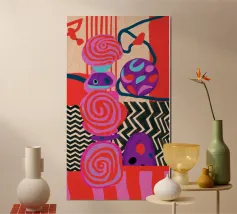 Una dinamica composizione astratta presenta forme, spirali e motivi audaci e ritmici in una vibrante tavolozza di rossi, rosa, blu e nero, creando un'opera energica e visivamente stimolante.
