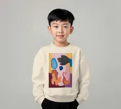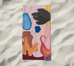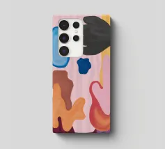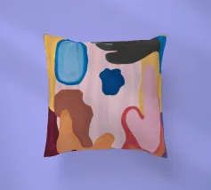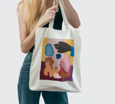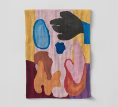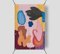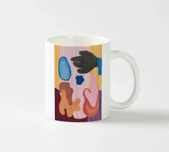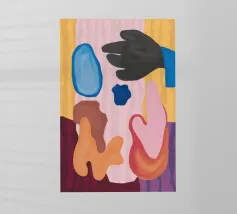 Un'opera d'arte astratta contemporanea con forme fluide e sovrapposte che suggeriscono forme umane e mani, in una sofisticata tavolozza di blu, marrone, rosa e beige.
