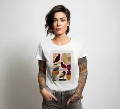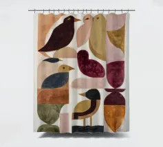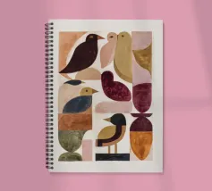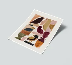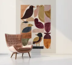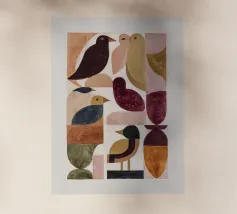 Uccelli stilizzati disposti in una tranquilla composizione geometrica. I colori caldi della terra e le forme semplici creano un equilibrio tranquillo e un ritmo gentile.