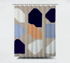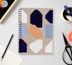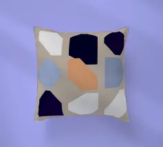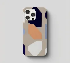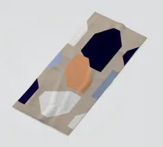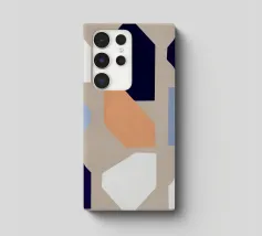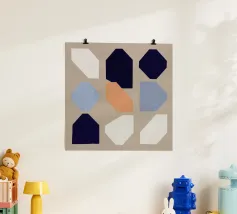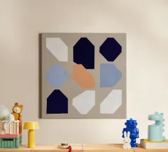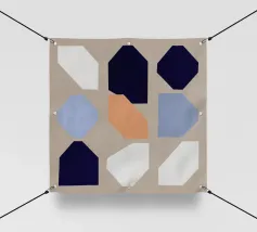 Varie forme geometriche sono disposte in modo apparentemente casuale su uno sfondo neutro. Le forme presentano una tavolozza di colori limitata, che comprende sfumature di blu, bianco e un pezzo arancione.