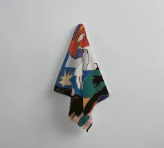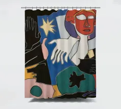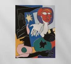 Questo dipinto mostra una composizione astratta con un mix di forme geometriche e organiche. I colori sono decisi e comprendono il nero, il blu, il rosso e il bianco. Le forme si sovrappongono e creano un senso di profondità.