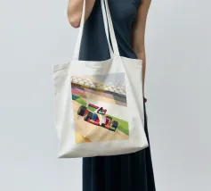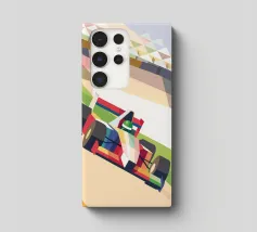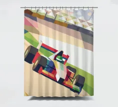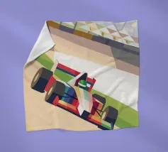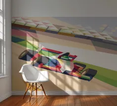Illustrazione di una moderna auto di Formula 1 su una pista con uno stile geometrico moderno.